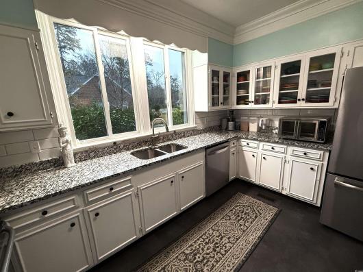Elegant brick ranch nestled on a quiet dead-end street; this stunning brick ranch offers timeless appeal and modern comfort. Step inside to soaring 9-foot smooth ceilings and a grand foyer. The formal dining room features custom corner China cabinets, while the living room is anchored by a striking marble fireplace. Inviting spacious kitchen with granite countertops open to breakfast nook and back porch. A cozy den, paneled in warm knotty pine, showcases a large brick-hearth fireplace—perfect for gatherings. Classic crown moldings, plantation shutters, and floor-length windows allow natural light to flood this gorgeous home. Enjoy the charming, screened back porch overlooking an expansive backyard, ideal for relaxation or entertaining. Additional highlights include a large pantry, huge carport and attic adding both convenience and functionality.