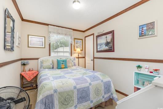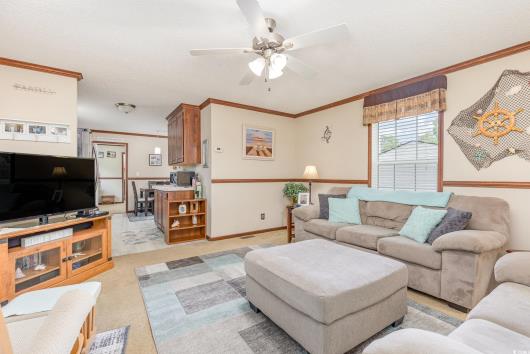 Nestled in the tranquil and gated community of Owens Mobile Park in Myrtle Beach, this charming 3-bedroom, 2-bathroom single-wide manufactured home offers an inviting coastal-inspired living experience. As you step inside, the living room greets you with warm, neutral tones, plush carpeting, and a ceiling fan, creating a cozy space to unwind. The open floor plan seamlessly connects the living area to a well-appointed kitchen and dining area featuring dark wood cabinetry, modern appliances, and ample counter space for meal prep. Each bedroom provides a comfortable retreat, with the master suite boasting an ensuite bathroom for added privacy. The additional bedrooms are perfect for family members or guests and share access to the second full bathroom, both adorned with tasteful fixtures and finishes. There is a designated laundry space for convenience. The outdoor space includes a covered porch, perfect for enjoying morning coffee,or unwinding at the end of the day. A large storage shed on the property provides additional space for tools and outdoor equipment. Home is being sold partially furnished! Located just minutes from the vibrant heart of Myrtle Beach, this home offers easy access to shopping, dining, entertainment, and, of course, the beach. Don’t miss out on the opportunity to own this lovely slice of Myrtle Beach paradise!