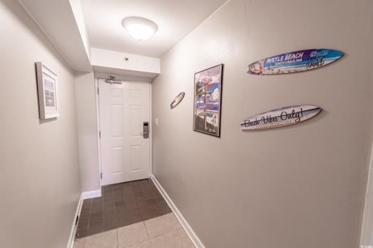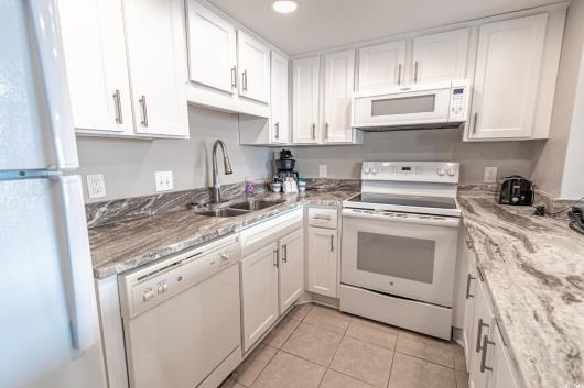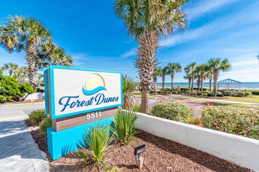 Discover coastal living at its finest in this beautifully designed one-bedroom, one-and-a-half-bath condo located in the highly desirable Forest Dunes Resort. Enter through a welcoming foyer where durable tile flooring flows seamlessly throughout the unit. The kitchen offers granite countertops, crisp white cabinetry, a convenient breakfast bar, and a cozy dining area—perfect for casual meals or entertaining. The open and airy living room is filled with natural light from a large sliding glass door that opens to a private balcony, where you can enjoy picturesque views of the pool and the nearby beach. The spacious primary bedroom features a closet, linen area, and private access to the bathroom. The well-appointed bathroom includes two granite vanities, dual toilets, and a custom-tiled shower, with additional hallway access for added convenience. Forest Dunes Resort provides an exceptional lineup of amenities, including private beach access, indoor and outdoor pools, a spa, a lazy river, indoor and outdoor lounge areas, an on-site restaurant, and a parking garage with elevator access and a covered walkway to the building. Ideally located near popular attractions, shopping, dining, nightlife, medical facilities, and the airport, this condo is perfect as a primary residence, vacation getaway, or investment property. Square footage is approximate and should be verified by the buyer.