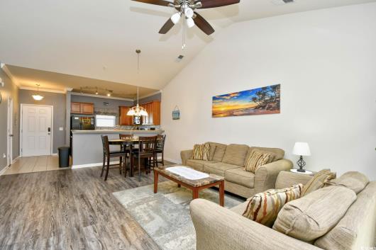 Discover coastal comfort in this well-appointed 2-bed, 2-bath, furnished condo located in the desirable Willow Bend neighborhood of Barefoot Resort in North Myrtle Beach. Designed for effortless living, this inviting unit features cathedral ceilings, tasteful furnishings, and new LVP flooring throughout, creating a clean, modern look that complements its spacious, open layout. The updated kitchen is equipped with contemporary finishes and plenty of storage, making cooking and entertaining a pleasure. The bright living area flows seamlessly onto a tranquil private balcony, perfect for morning coffee, evening relaxation, or simply enjoying the peaceful resort surroundings. Both bedrooms are generously sized, each paired with its own full bath for added convenience and privacy. The condo comes fully furnished, making it move-in or rental-ready from day one. A rare advantage in Willow Bend is that this is the only neighborhood in Barefoot Resort that ALLOWS RENTERS TO VACATION WITH THEIR PETS, making this a highly desirable option for pet-friendly living or investment use. Residents also enjoy access to the resort's exceptional amenities, including pools, walking paths, golf courses, and more. Residents have exclusive access to a private neighborhood pool, the 15,000 sq. ft. North Tower pool, and the brand-new oceanfront beach cabana. And getting to the beach is a breeze! Take a quick ride or hop on the seasonal beach shuttle for easy access to the sand and surf. Located within a premier golf community with world-class courses, this condo places you close to everything the Grand Strand has to offer. There is an attached outside storage closet for all your beach items. Golf membership is available at a significant discounted rate (for more information, ask the listing agent).